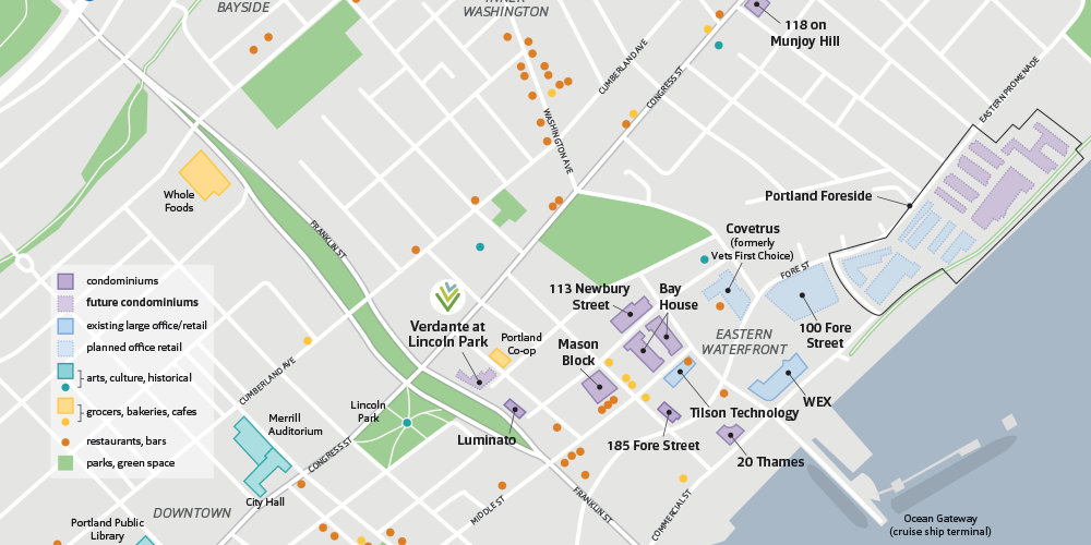 These are exciting times as a new epicenter in eastern Portland is being created. WEX has started moving workers in, new hotels are opening, and much construction of office and retail space is underway. 20Thames is approaching a sell out and Verdante at Lincoln Park condominium is on the horizon. We love the location of Verdante as it is on the edge of the India Street neighborhood and eastern waterfront area, yet equally close to the evolving Inner Washington Avenue neighborhood and an easy hop onto I-295.