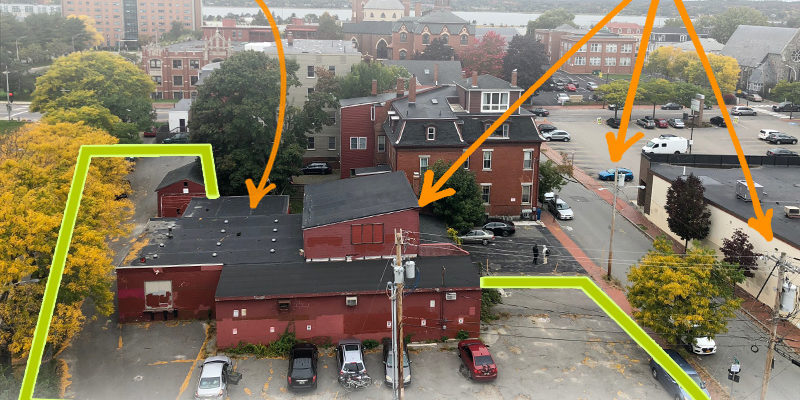 Along Franklin, Federal, and Hampshire streets. It is currently a surface parking area and an old storage building—the kind of thing we all walk past every day and never really notice. In this aerial photo, you can see how the building will sit on the site and in the neighborhood.