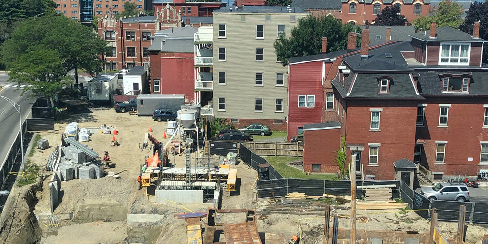 Here is what we mean by “What goes up must go down (first).” After demolishing the existing building, the next step in construction is excavation and the forming and pouring of foundations. Because of the complexity of the site, the building will “go up” in three phases, with the first phase being closest to Congress Street. The initial effort was to dig, frame, and pour nine very large footings in the northern portion of the site, and to form and pour frost walls around much of that area.